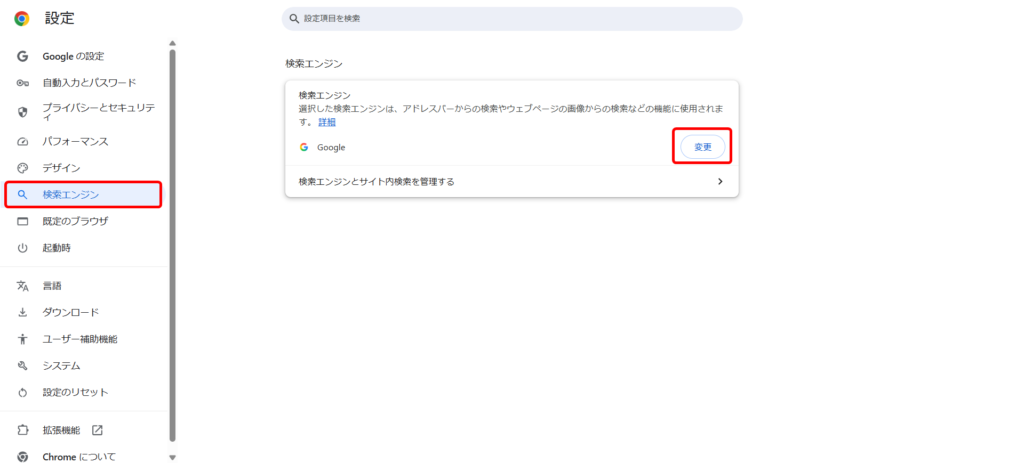 ③左側のメニューで「検索エンジン」をクリックし、「変更」をクリック