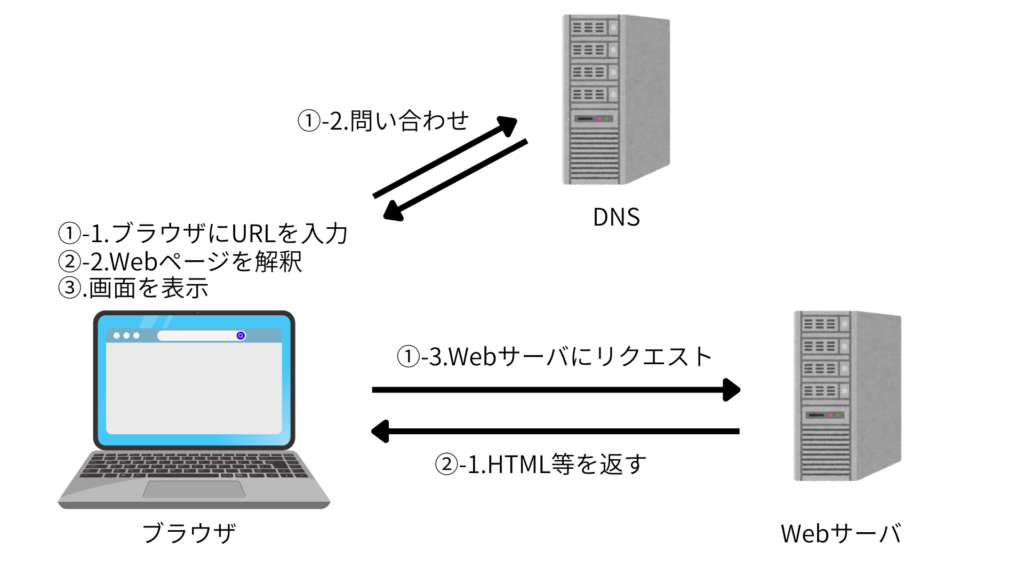 ブラウザにURLを入力すると、ブラウザはDNSに問い合わせし、対象のWebサーバのIPを取得します。そして、WebサーバへこのURLにある情報を見せてとリクエストを送信します。